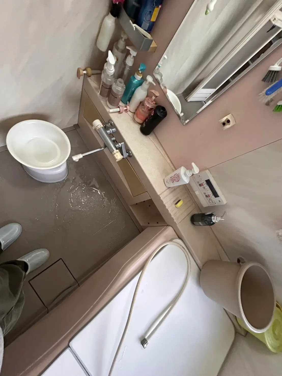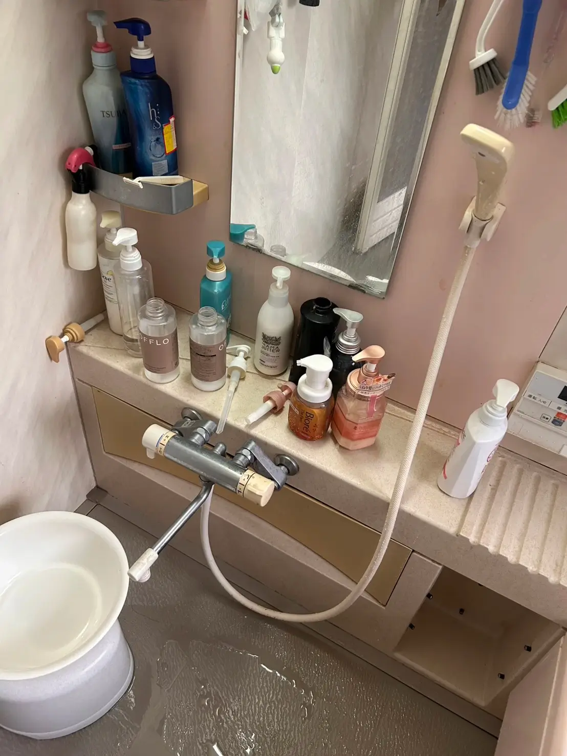 今回の現場では、浴室シャワーのホース部分に経年劣化が見られ、微細な亀裂から水漏れが発生している状態でした。