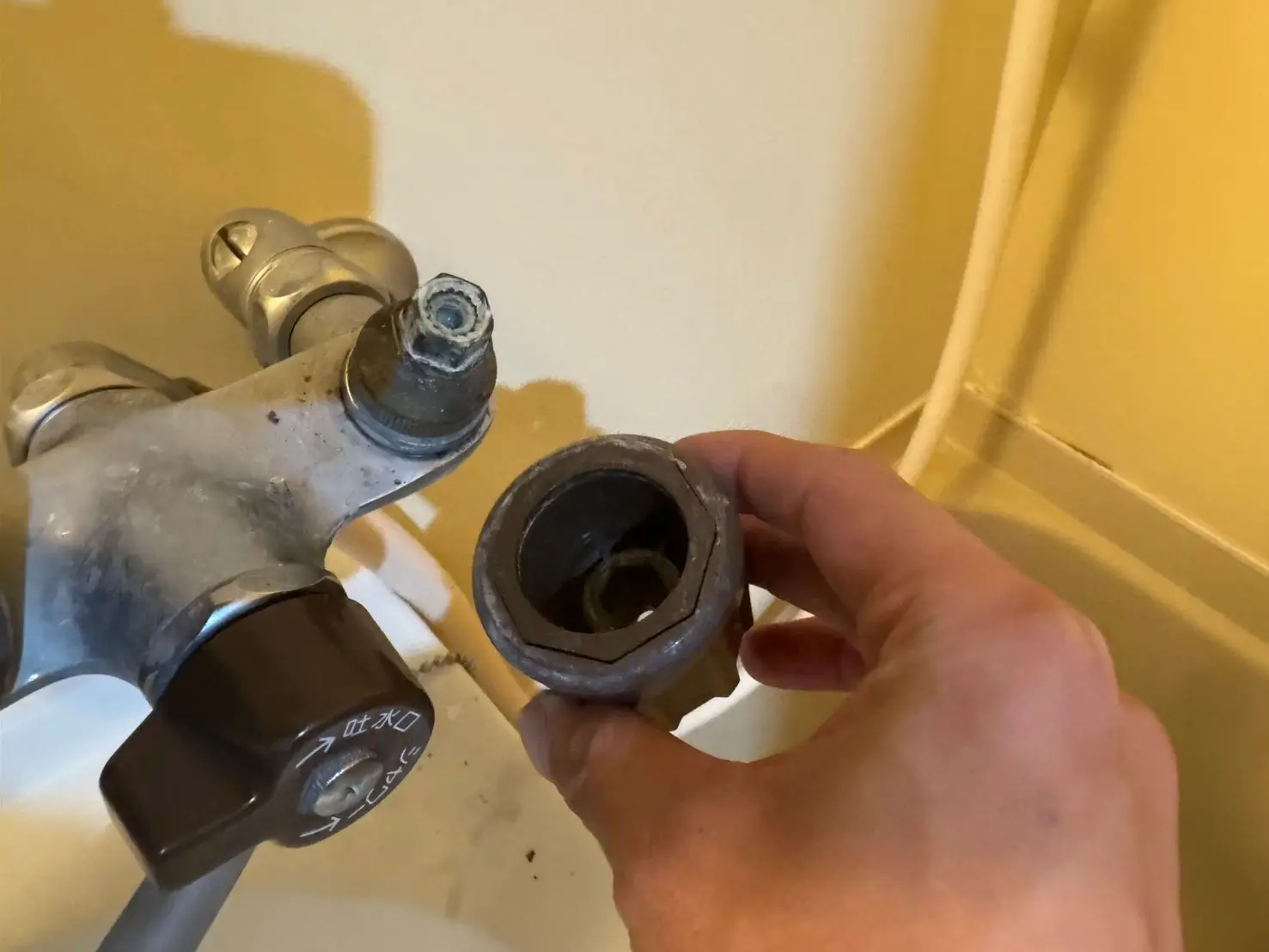 現地で確認したところ、水栓内部のハンドル部品が劣化しており、正常に開閉できない状態でした。