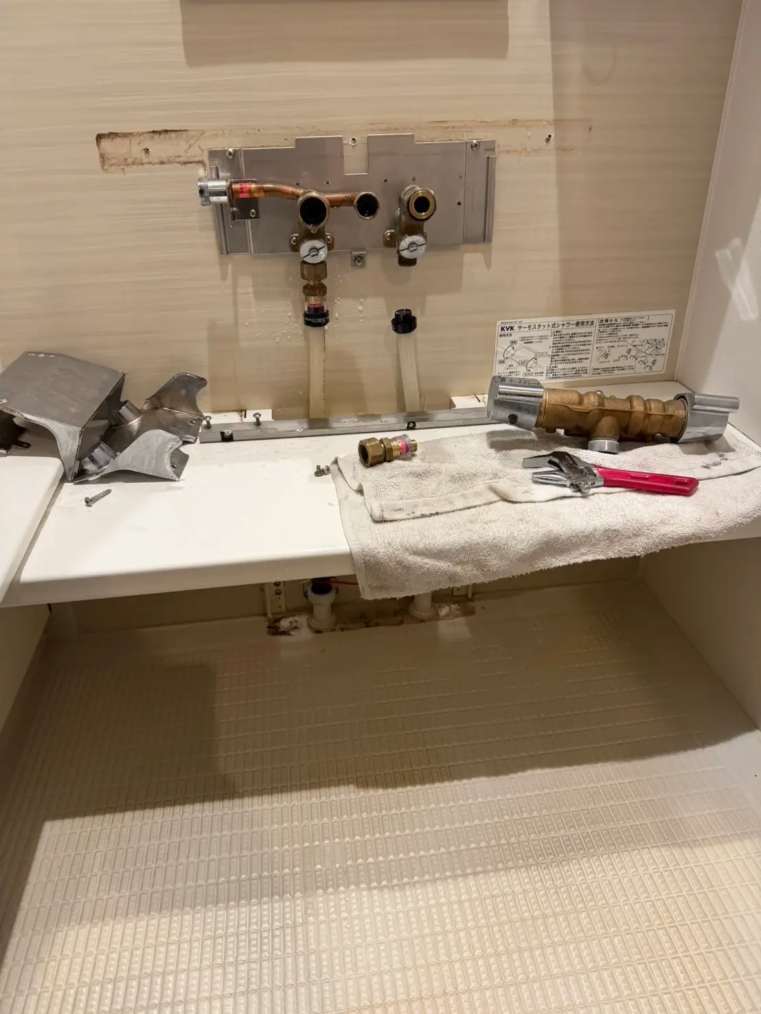 お伺いした際には、浴室蛇口の根本パネル部分から水が滲み出しており、内部での漏水が疑われる状態でした。