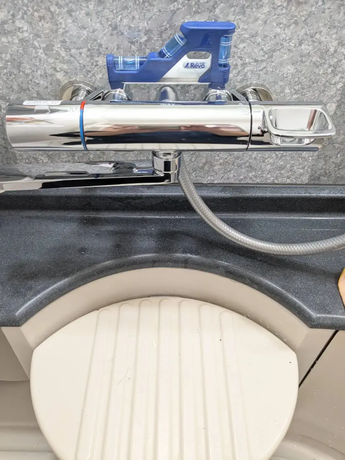 あわせてシャワーフックの取替、給水偏心管の設置も実施し、周辺設備も整えました。